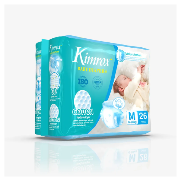 Kimrox Baby Diapers are crafted with your baby’s comfort and protection in mind. Our diapers feature a soft,ultra thin, Light weight breathable outer layer and a super-absorbent core that keeps your baby dry and avoid Rashes. The flexible waistband and leg cuffs provide a secure fit, preventing leaks and allowing your baby to move freely. With a focus on gentle care, Kimrox Baby Diapers are free from clorine and harsh chemicals, ensuring your baby’s sensitive skin is protected.