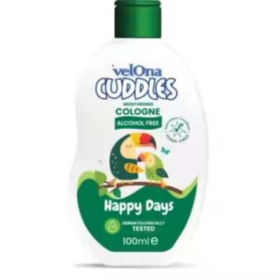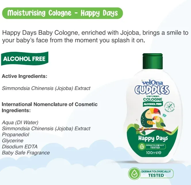 Happy Days Baby Cologne, enriched with Jojoba, brings a smile to your baby’s face from the moment you splash it on . Velona Cuddles ensuring safety and well-being of ones. It Refreshes and comforts. Gentle, soothing fragrance