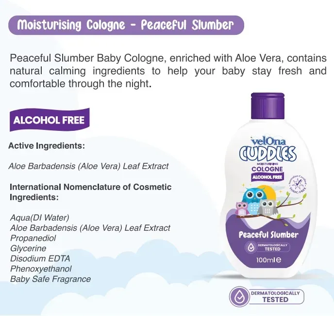 Peaceful Slumber Baby Cologne, enriched with Aloe Vera, contains natural calming ingredients to help your baby stay fresh and comfortable through the night.. safely used selected ingredients ensuring little ones safety.